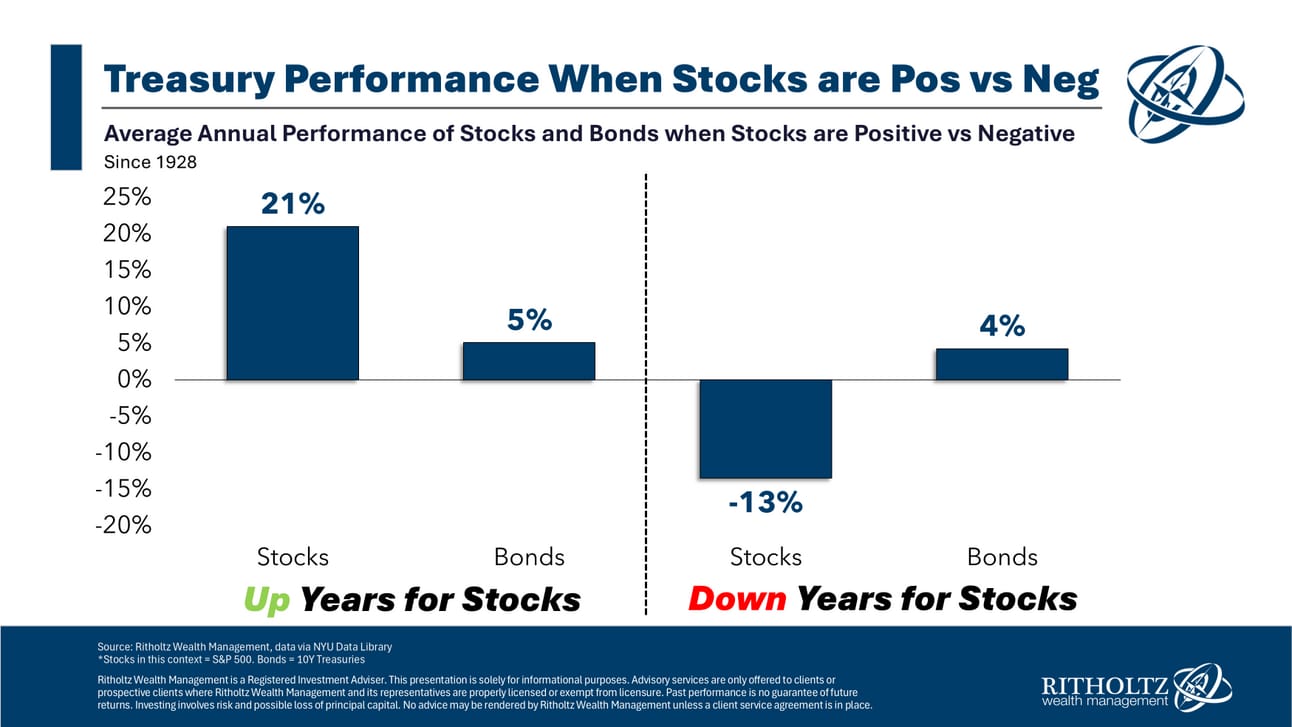 2022 was an anomaly. Both the stock and bond markets had double-digit negative returns. Ben Carlson at A Wealth of Common Sense looks at the historical record of what happens in the bond market when stocks decline. He writes: