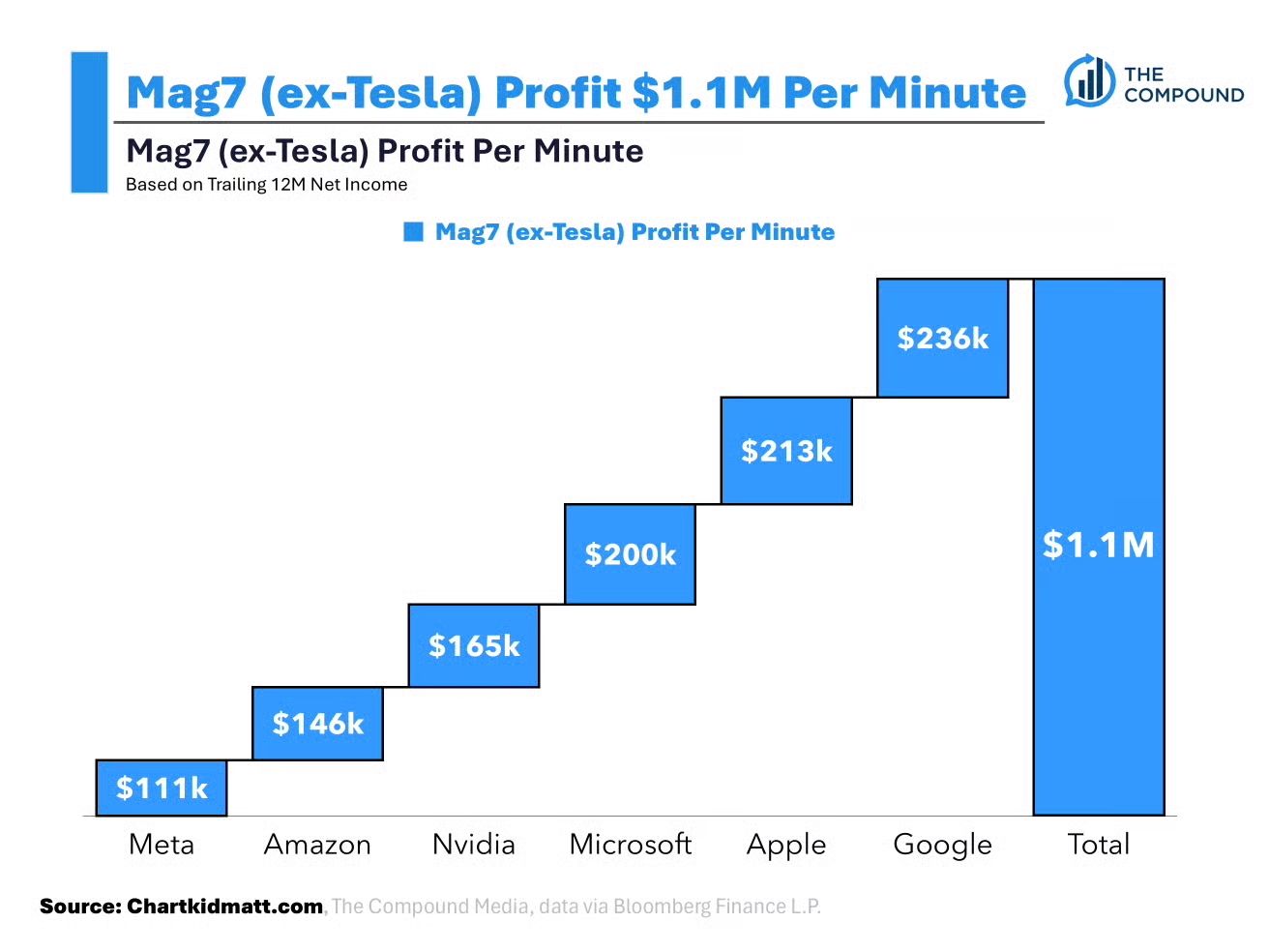 By any standard, the technology stock boom has been impressive. You can see here how it compares to prior booms. It is worth noting that they have also achieved unprecedented profitability. Matt Cerminaro at Chart Kid Matt examines how much the Mag 7 (ex-Tesla) companies earn every minute.