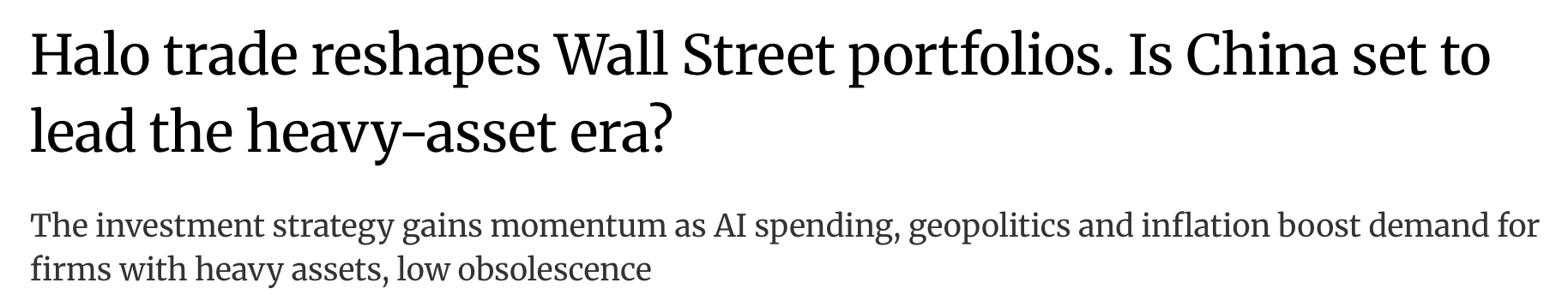 Last month, Josh described what he called the biggest theme of 2026: ‘HALO.’ Heavy assets, low obsolescence. In short, stocks that AI can’t disrupt. Josh followed up with a post with some actual names that fit the theme. The (global) media has picked up the theme and has run with it. You can find HALO mentioned in Morningstar, Business Insider, Investopedia, Financial Review, The Week, SCMP, AFR, and elsewhere.