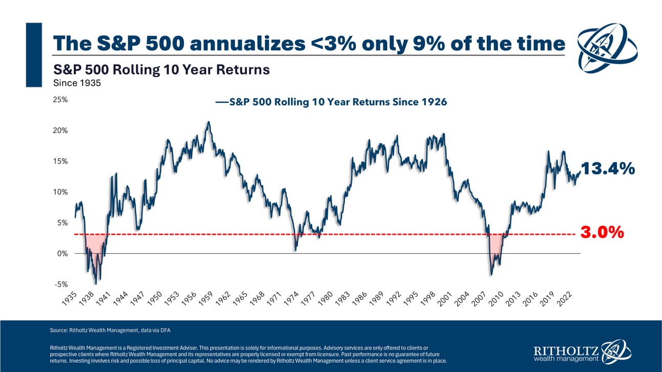 Of late, it feels like the U.S. stock market can’t go down, but any look at market history shows no shortage of declines. Long-term market forecasts are tenuous, so Ben Carlson recommends good old-fashioned diversification to blunt the possibility of a ‘lost decade.’