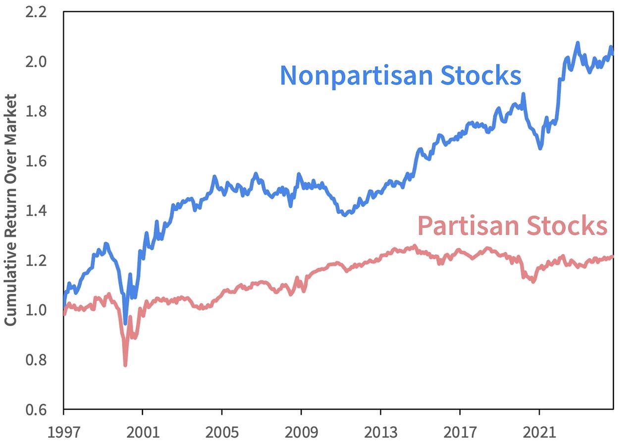 Nonpartisan stocks appear to offer the dual benefit of higher return and lower risk. To be clear, these companies are not “apolitical,” abstaining from the political process. On the contrary, they are highly proactive in ensuring they have “a seat at the table.” That said, they do not let partisan politics get in the way of their business objectives.